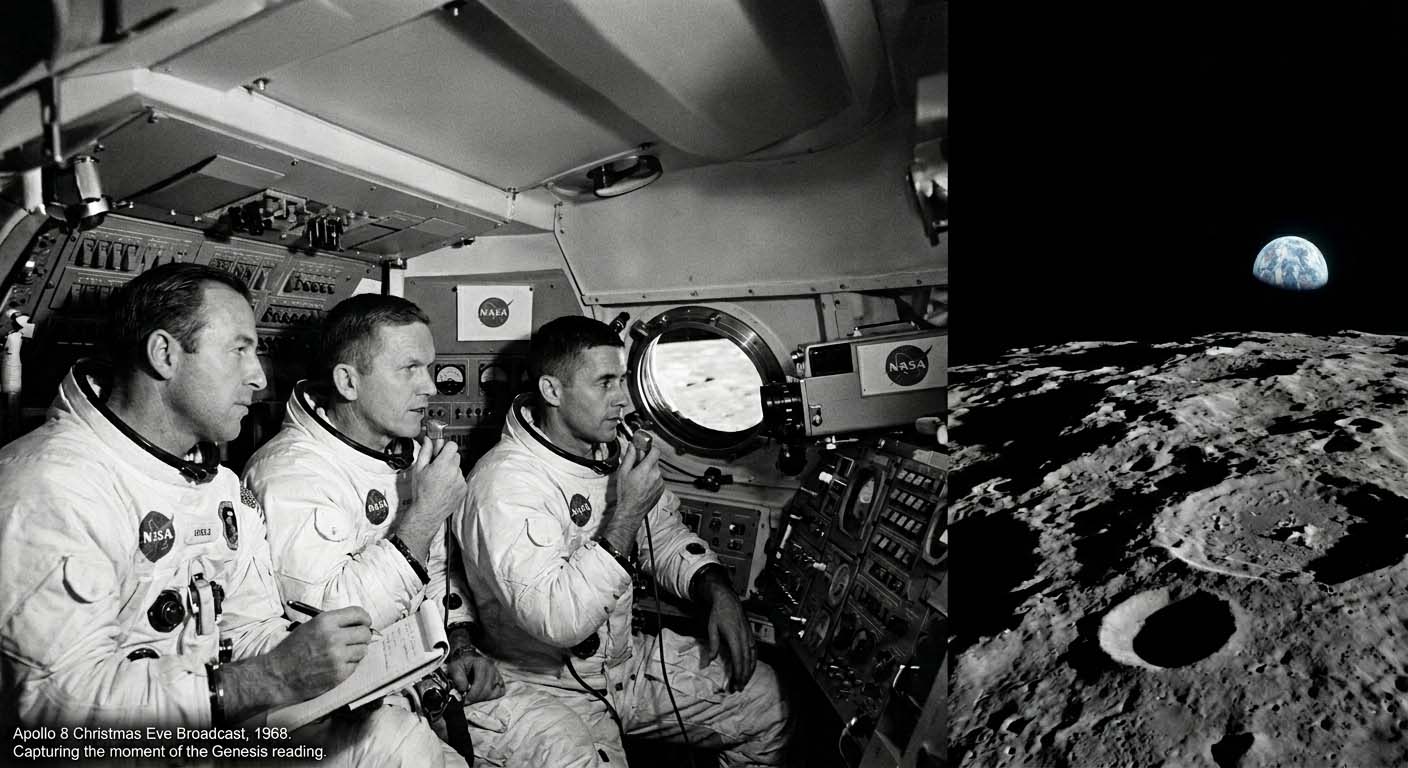 1968 නත්තල් සැන්දෑවේ, මුළු ලෝකයාම රූපවාහිනී තිර අසලට රොක් වූහ. ෆ්‍රෑන්ක් බෝමන්, ජිම් ලොවෙල් සහ බිල් ඇන්ඩර්ස් තිදෙනා සඳෙහි පිටුපස අඳුරු සහ සීතල මතුපිට පෙන්වමින් මිනිත්තු 27 ක විස්තරයක් ඉදිරිපත් කළහ. අවසානයේ, මුළු විශ්වයම නිහඬ කරවමින් ඔවුන් බයිබලයේ ‘උත්පත්ති පොතේ’ (Book of Genesis)  කොටස් මාරුවෙන් මාරුවට කියවන්නට වූහ.